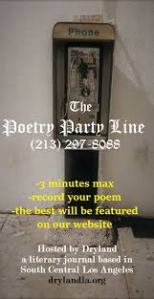 Our friends over at DRYLAND, the literary journal out of South Central Los Angeles, have opened up a Poetry Party Line. I adore this concept! Alls you got to do is call (213)297-8088, introduce yourself/where you are calling from, and read your poem (2 minute max). Then send your 50 word bio to submissions@dryland.org